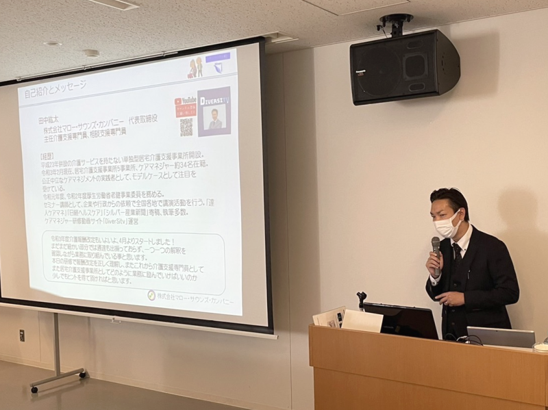 今回の研修会では令和3年度に改正された介護保険制度と報酬をテーマに、当協議会の幹事でもあります株式会社マロー・サウンズ・カンパニーの田中紘太氏を講師にお迎えいたしました。